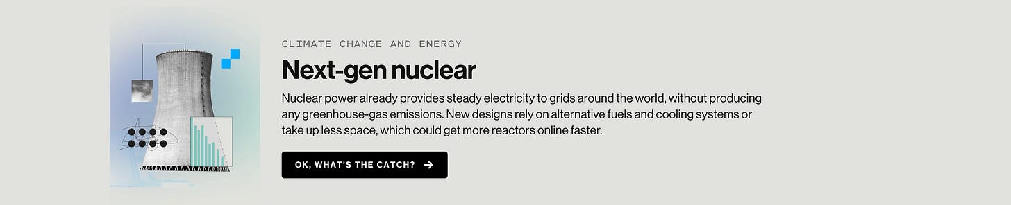 Essa é a segunda trend com energia que o MIT traz. Os reatores nucleares convencionais são enormes, caros e complexos de construir, exigindo décadas de planejamento e bilhões de dólares em investimento. Essas usinas gigantescas, embora eficientes para alimentar cidades inteiras, apresentam desafios: riscos de segurança elevados, custos proibitivos, tempos de construção extremamente longos.
