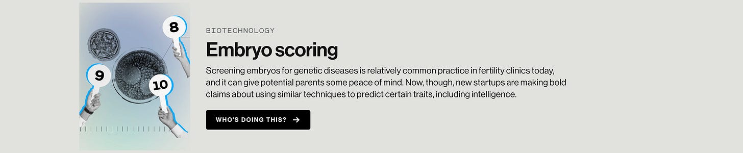 Agora, os testes genéticos evoluíram. Algumas startups estão oferecendo PGTP (teste genético pré-implantação para distúrbios poligênicos) que avaliam características que surgem de interações entre centenas ou milhares de variantes genéticas. O score de risco poligênico oferece probabilidades estatísticas sobre características que um embrião pode desenvolver, como predisposição a certas doenças, altura, ou até QI.